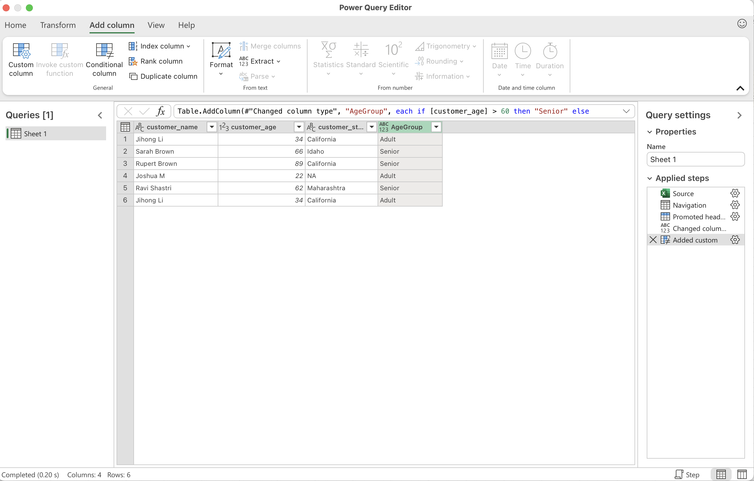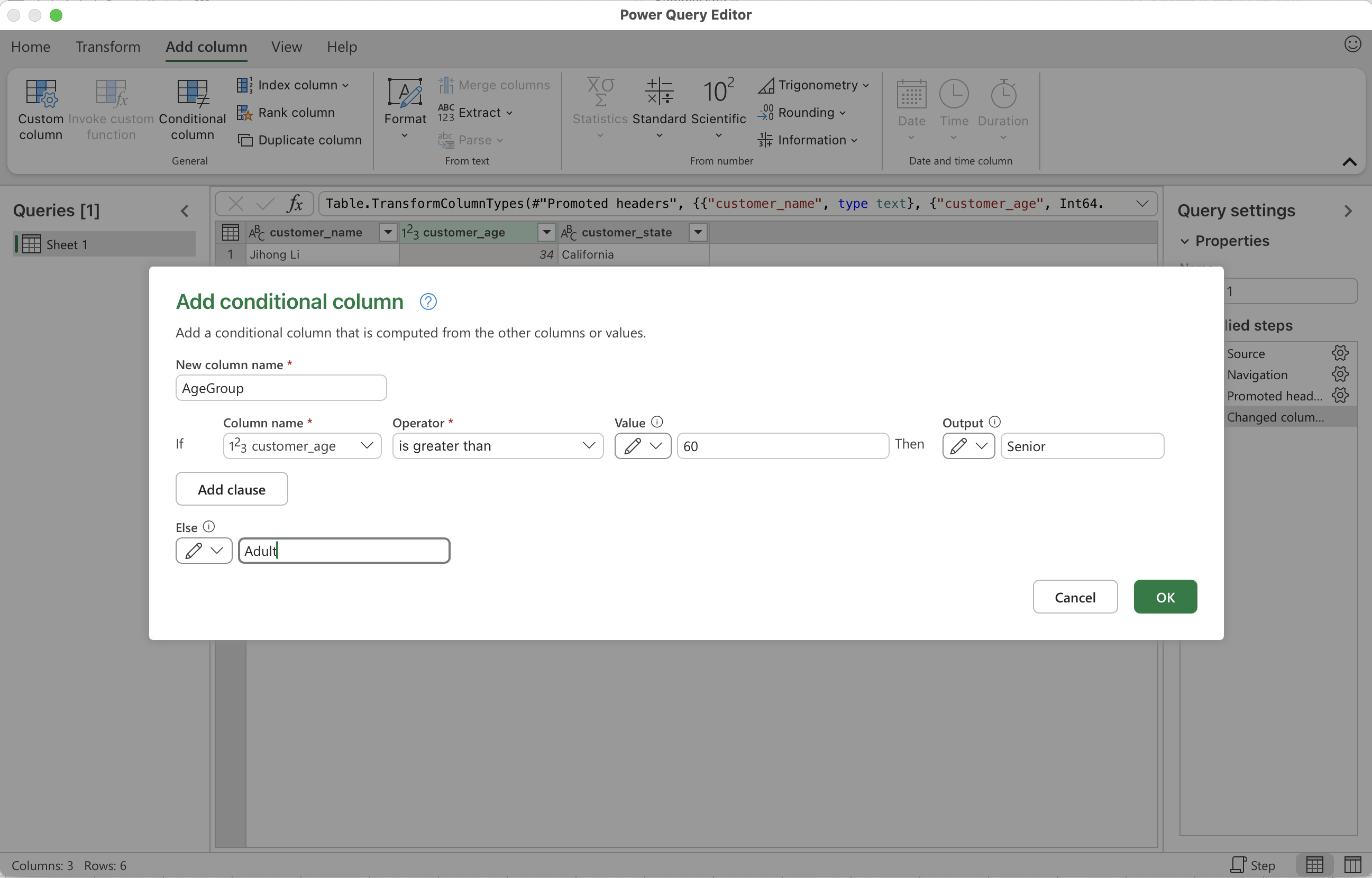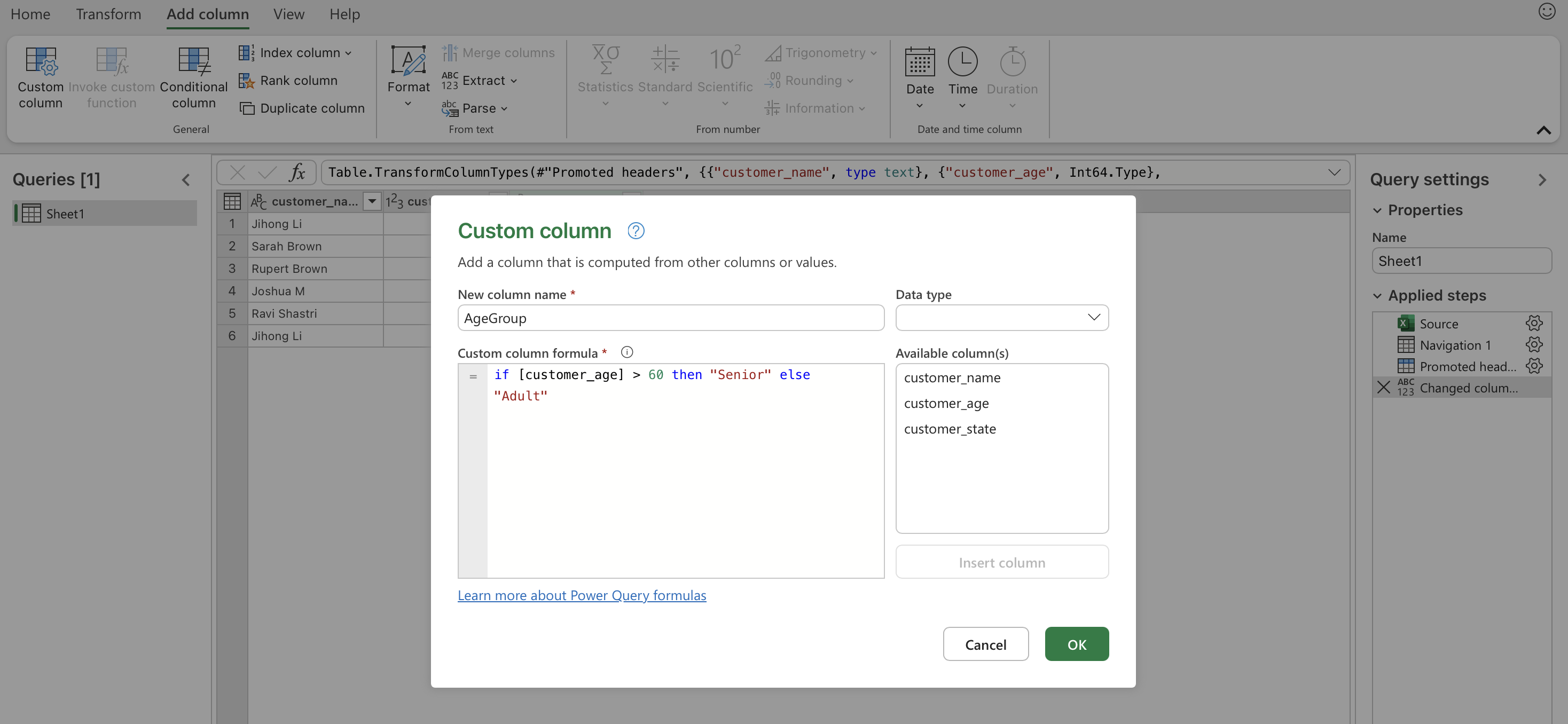 • Power Query will create a new column showing whether each customer is a Senior or Adult