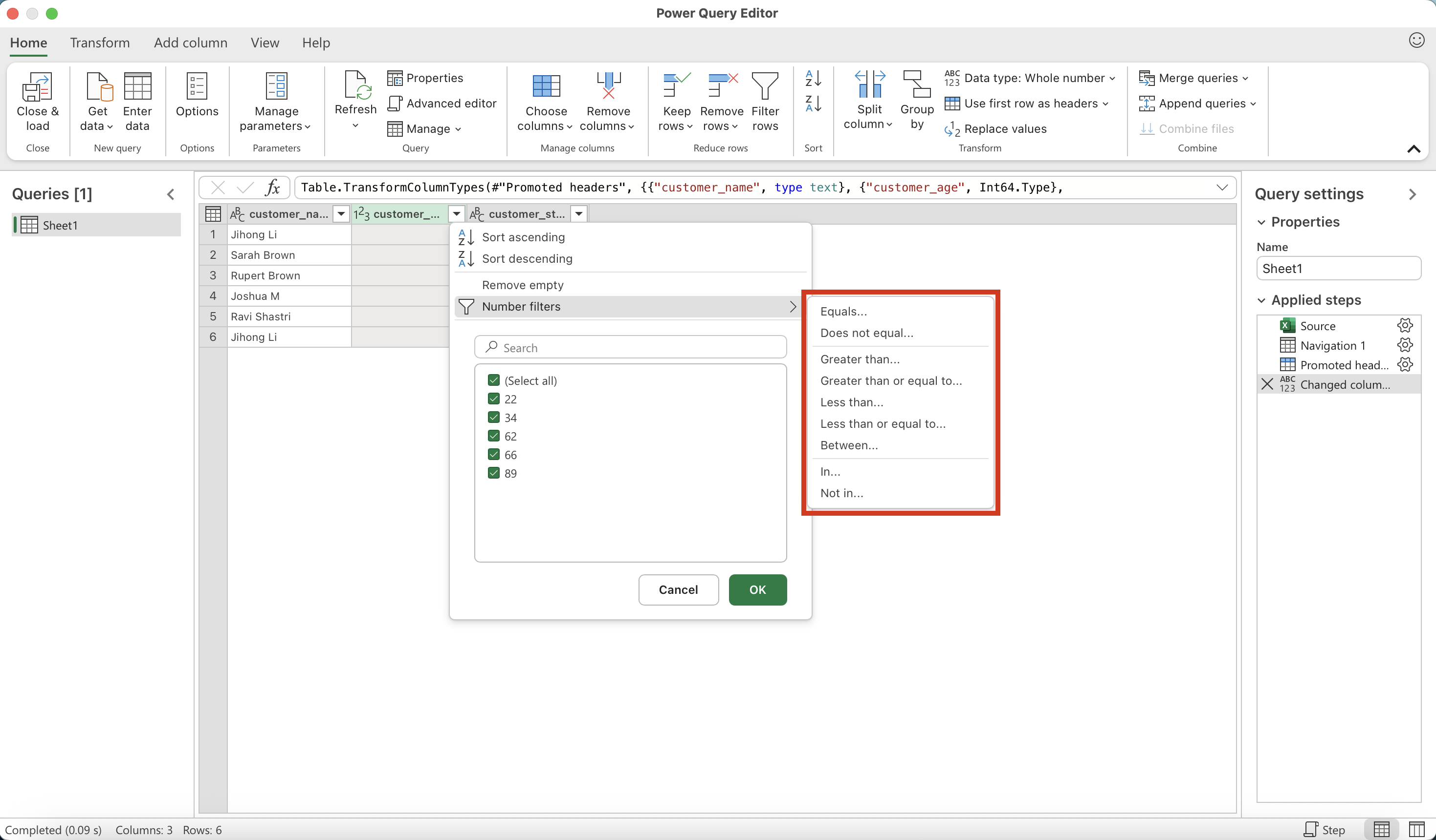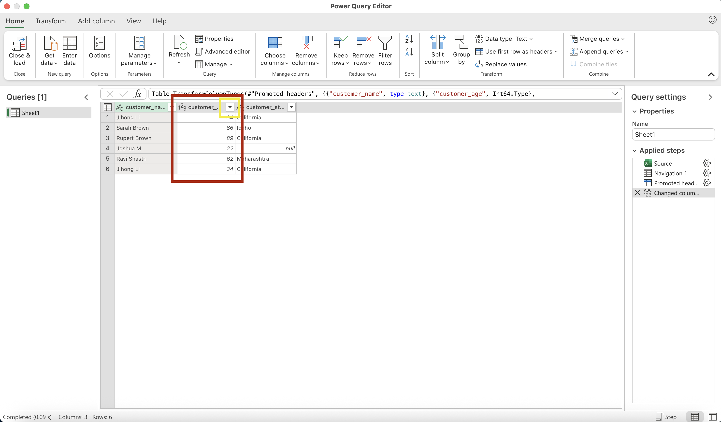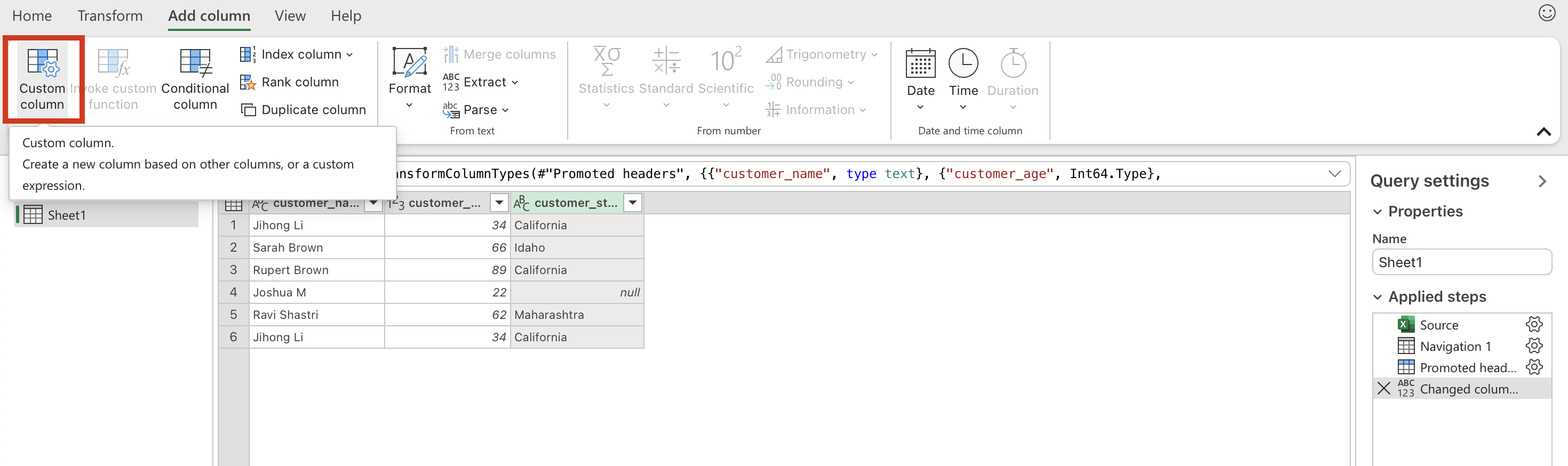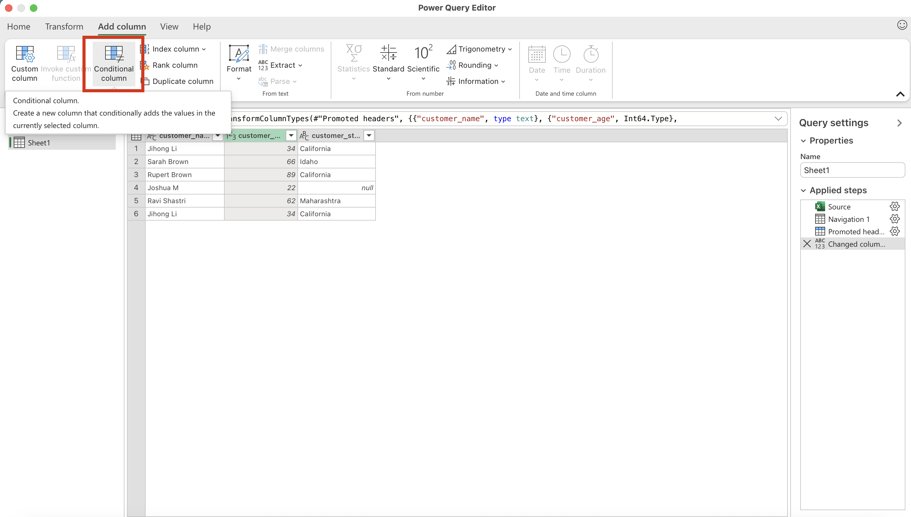 • Power Query will create a new column showing whether each customer is a Senior or Adult
