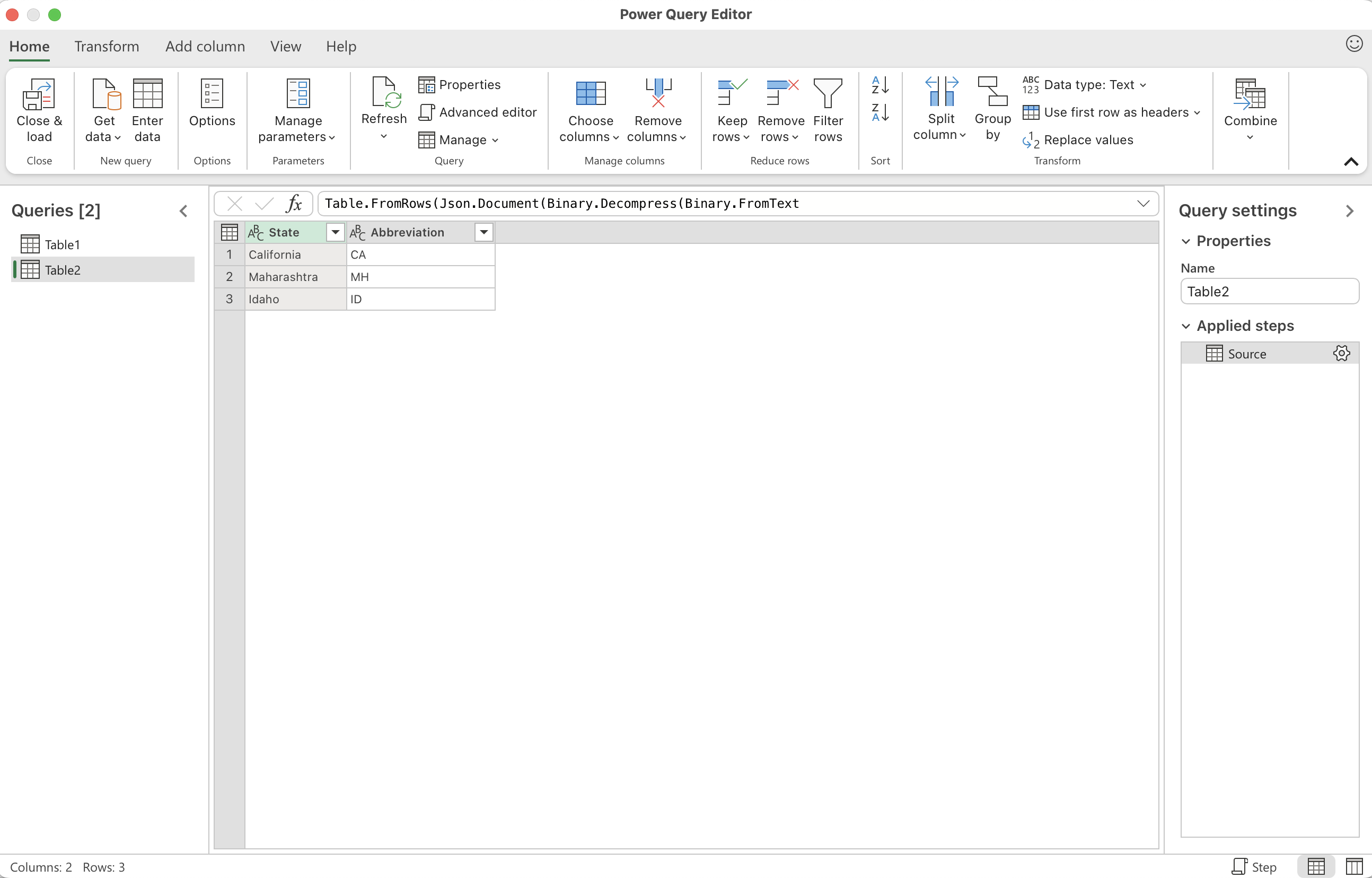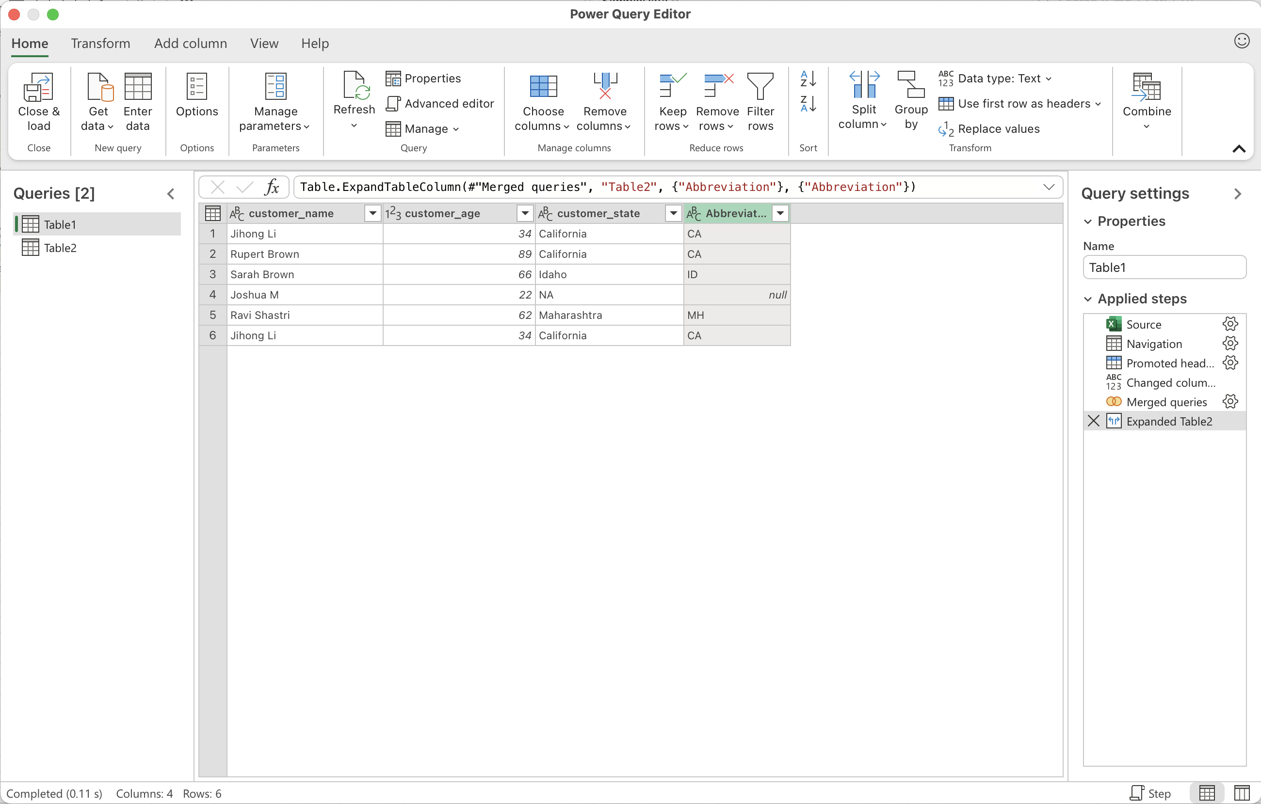 • Power Query expands the data, showing the new Abbreviation column alongside your original table