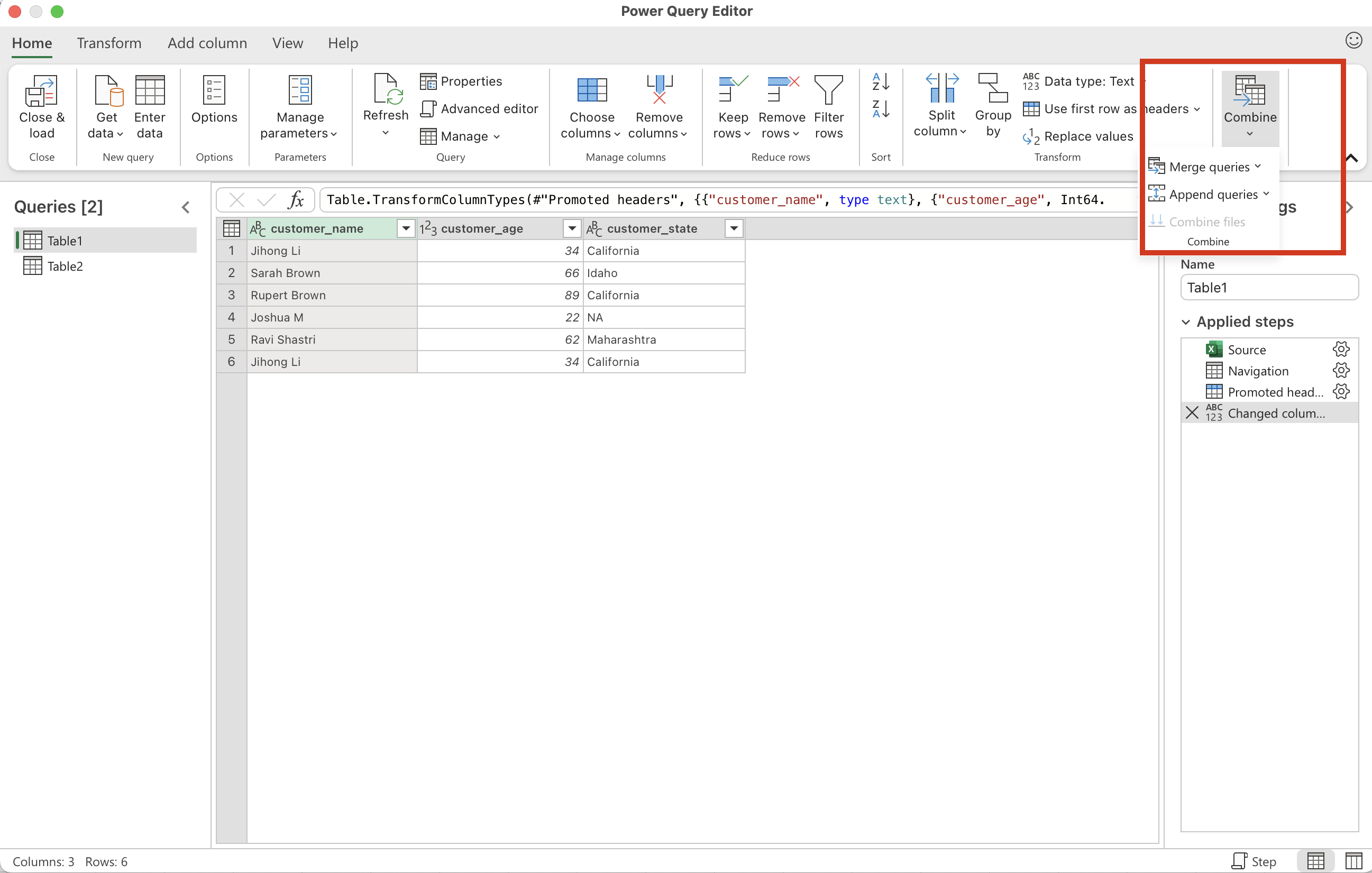 • Go to the Home tab, click Combine, and choose Merge Queries