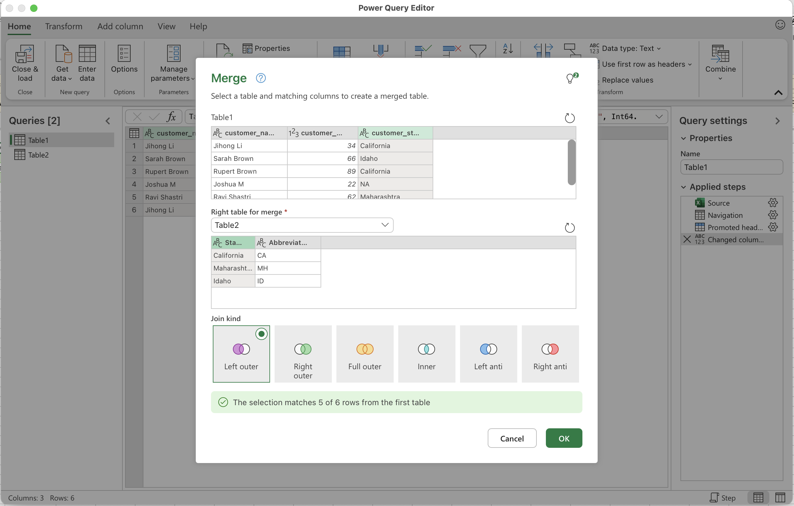 • In the Merge dialog, select customer_state from Table1 and State from Table2 as the matching columns