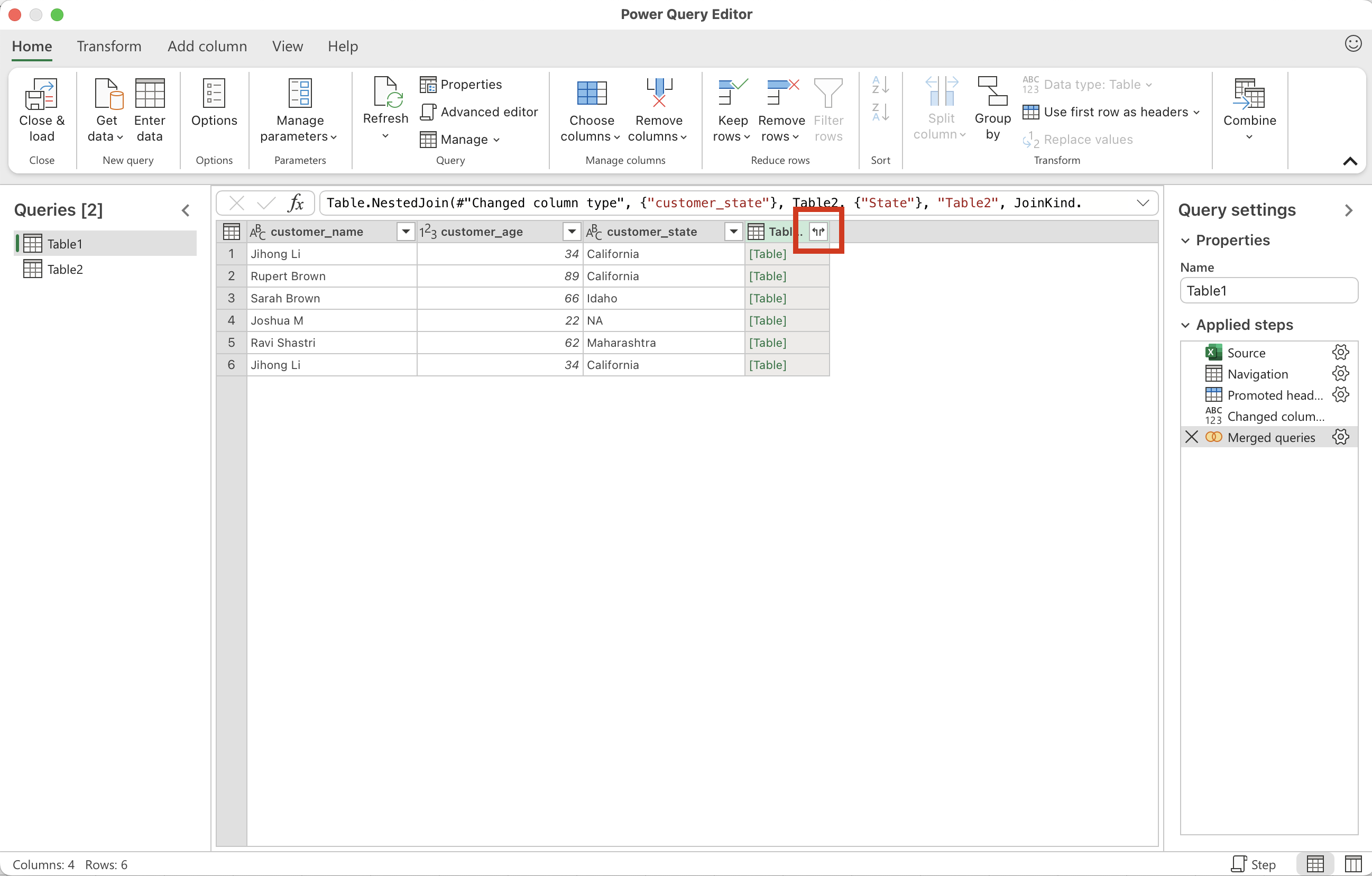 • A new column with [Table] values appears — click the expand icon (two arrows) on top of this column