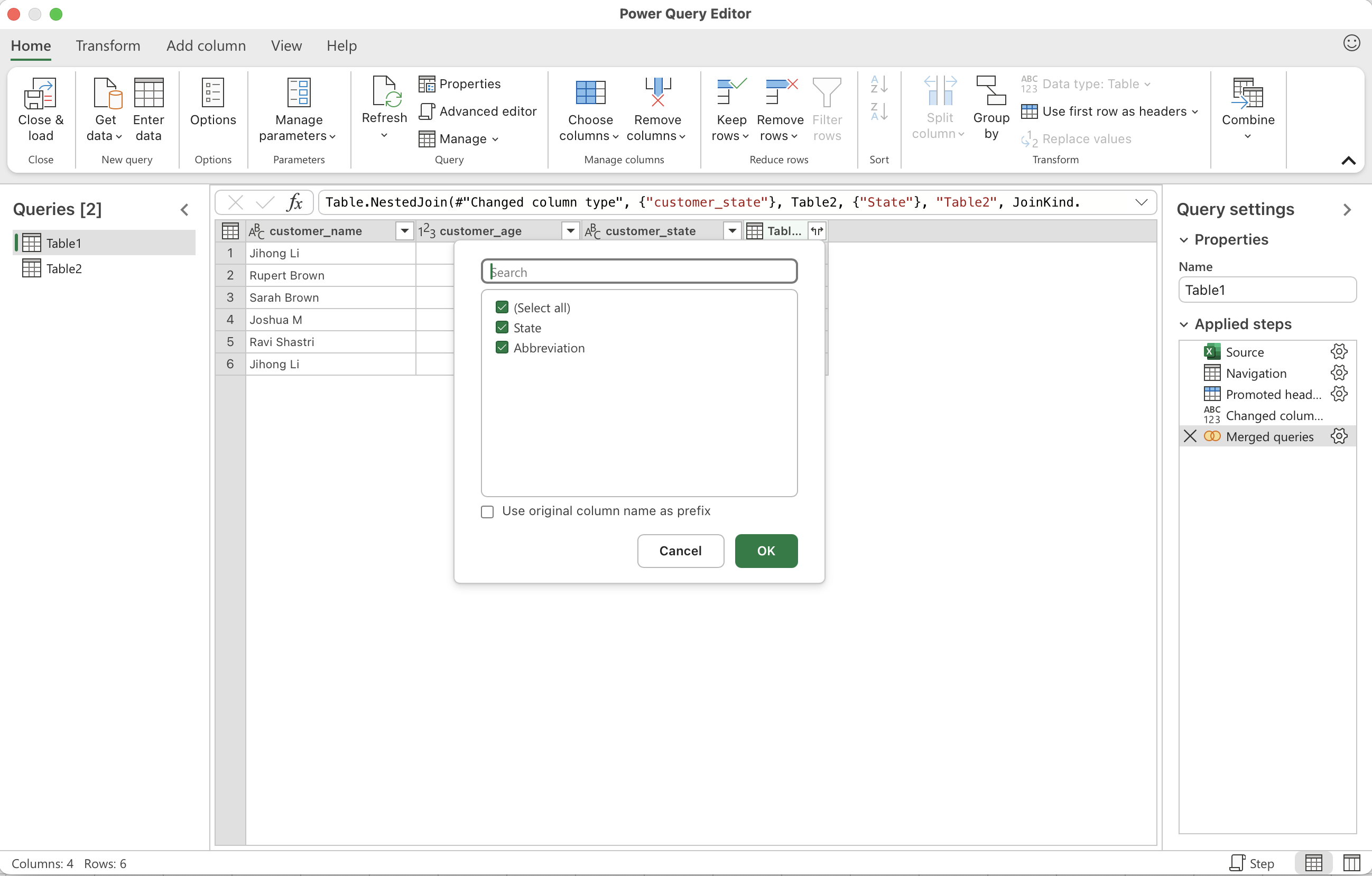 • Select the columns you want to bring in from Table2 (e.g., Abbreviation) and click OK