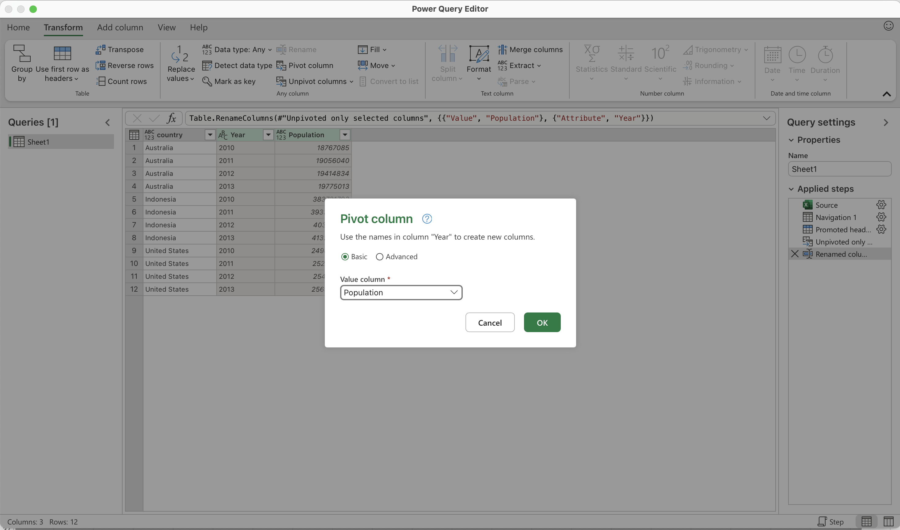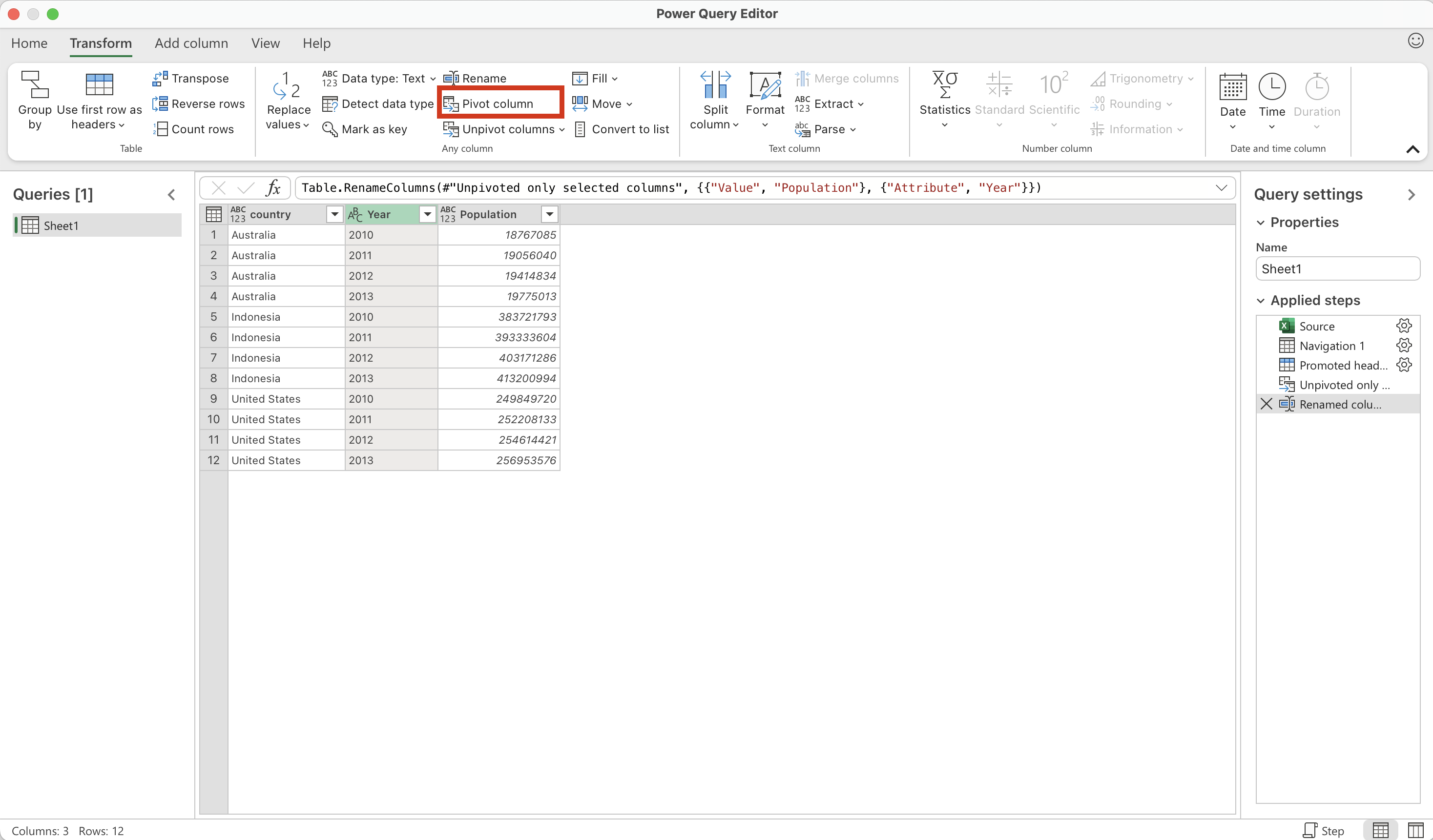• Power Query will create two new columns: Attribute (Year) and Value (Population)