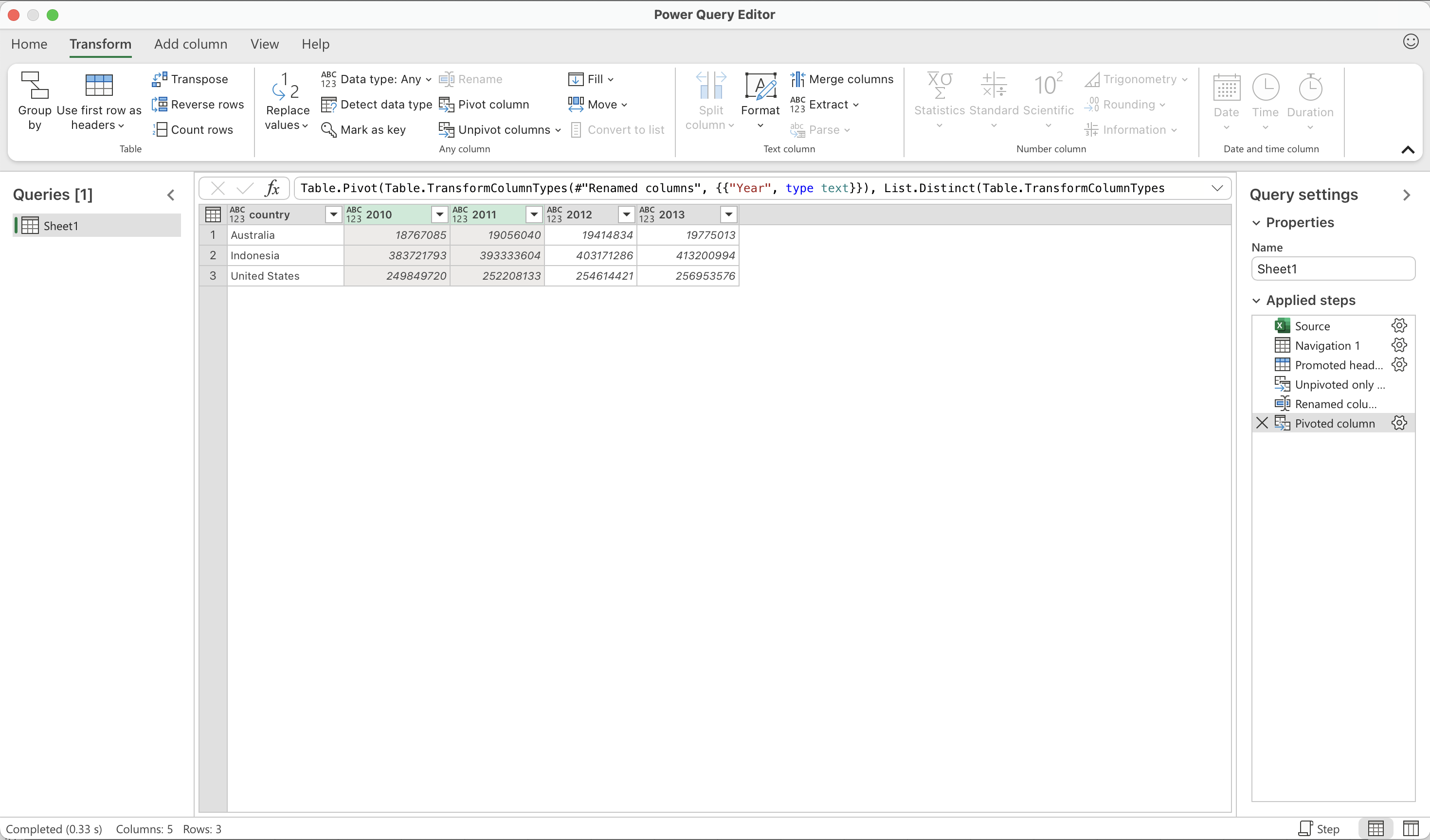 • Power Query will rearrange the table into wide format, creating separate columns like 2010, 2011, 2012, 2013