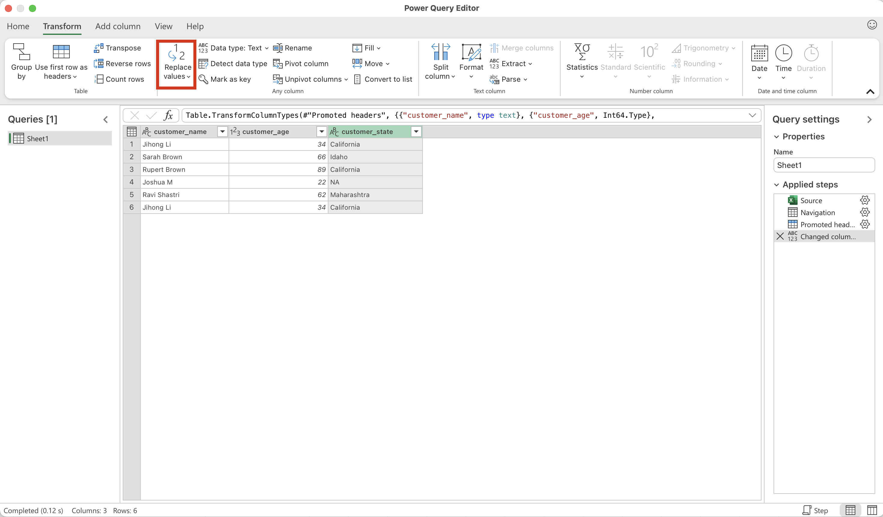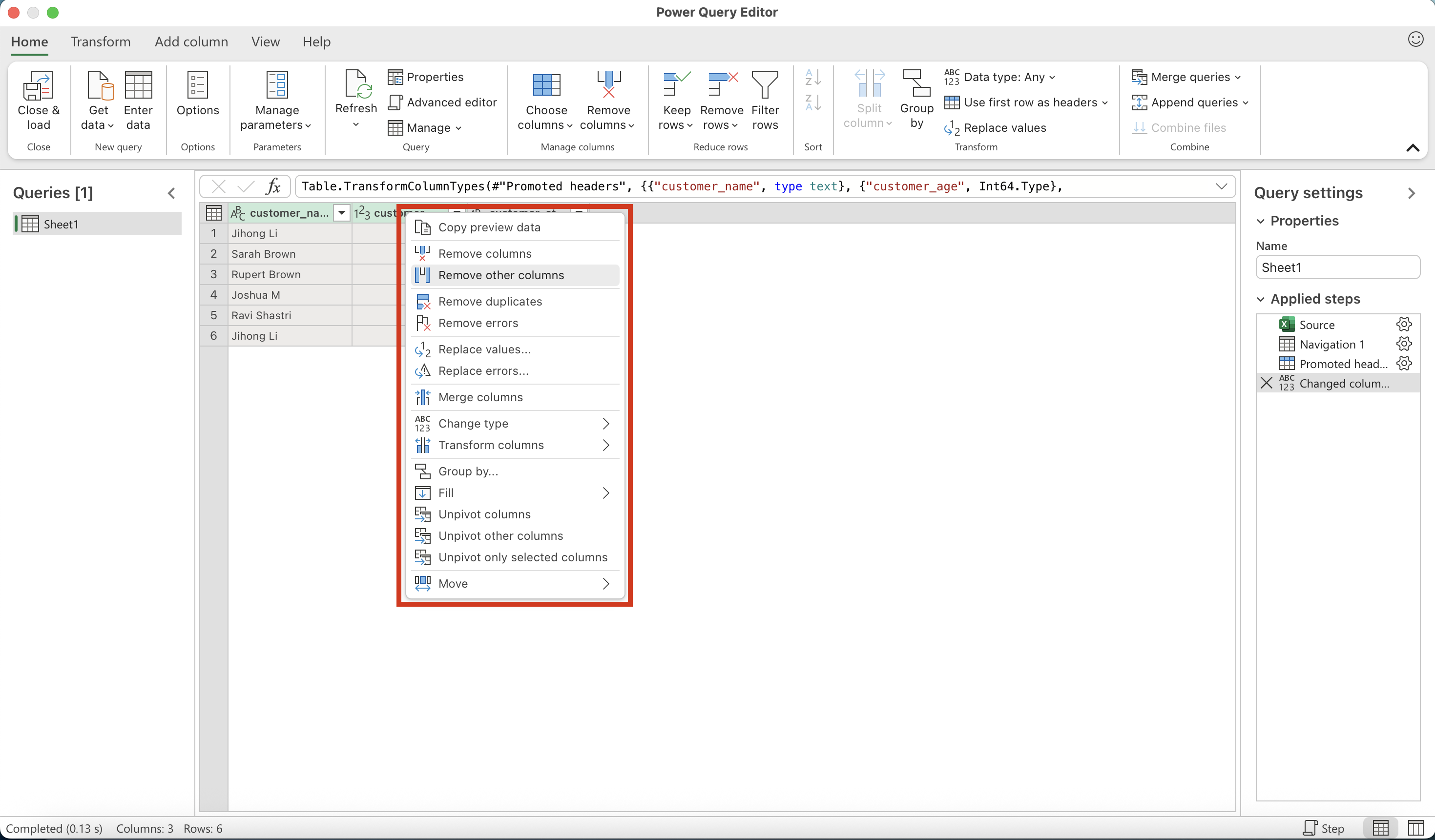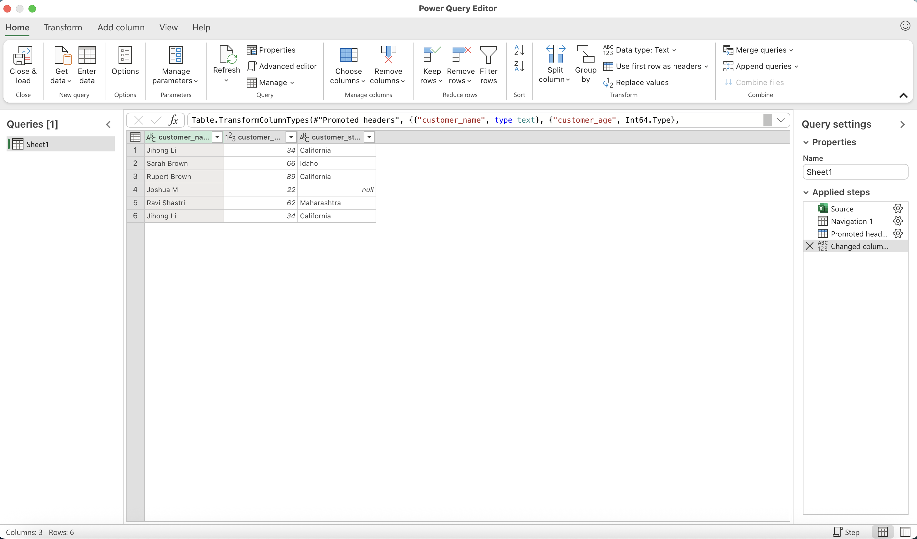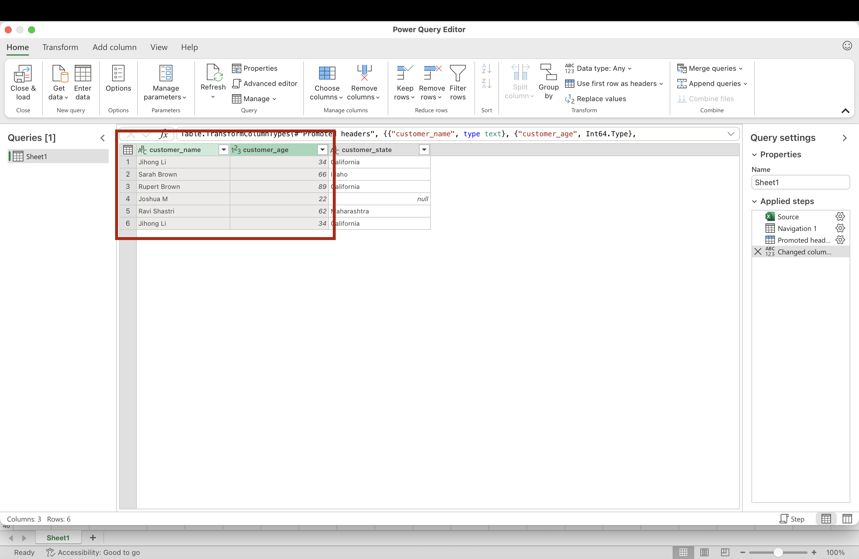 The Query Settings panel (on the right side) shows the name of your query and keeps track of every step you take while cleaning your data. It’s like a timeline of your work, easy to follow, easy to fix, and super helpful when you want to reuse or update your process later.