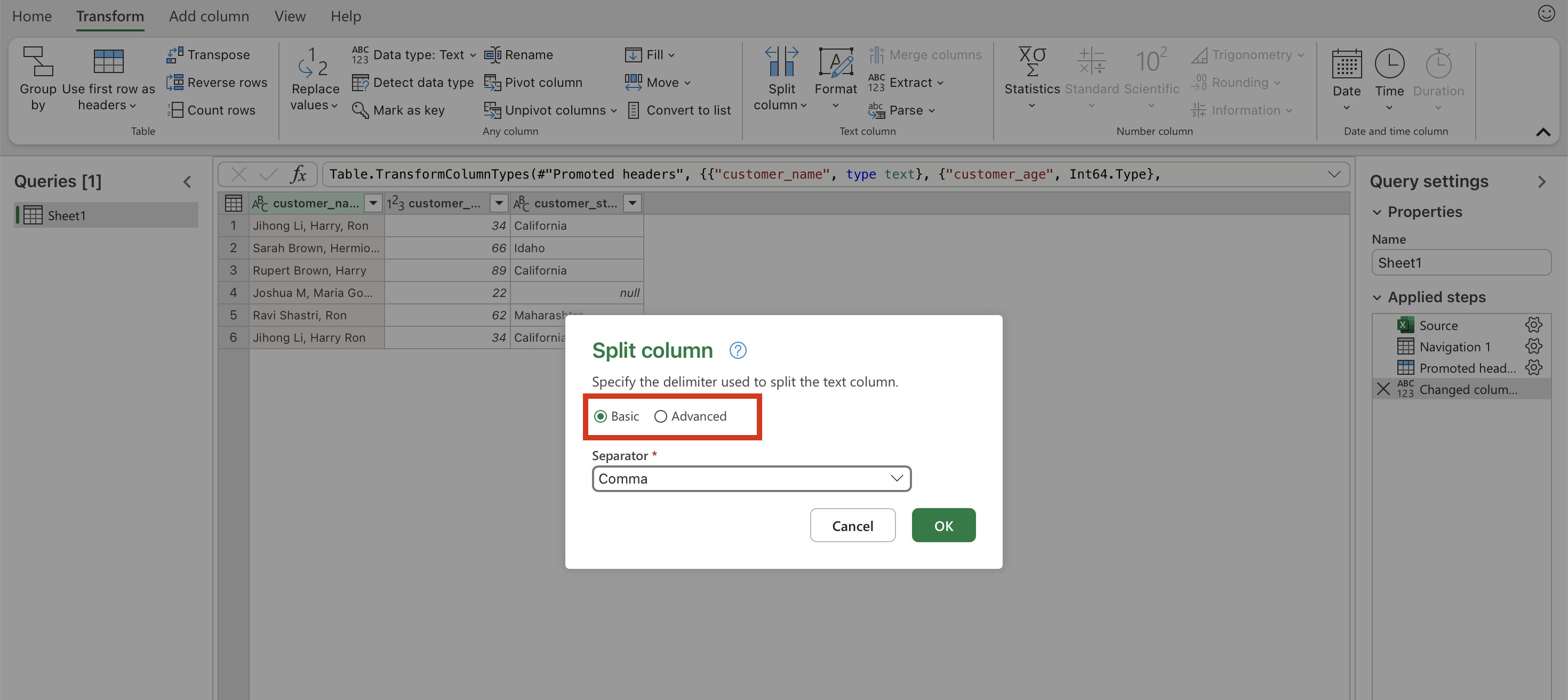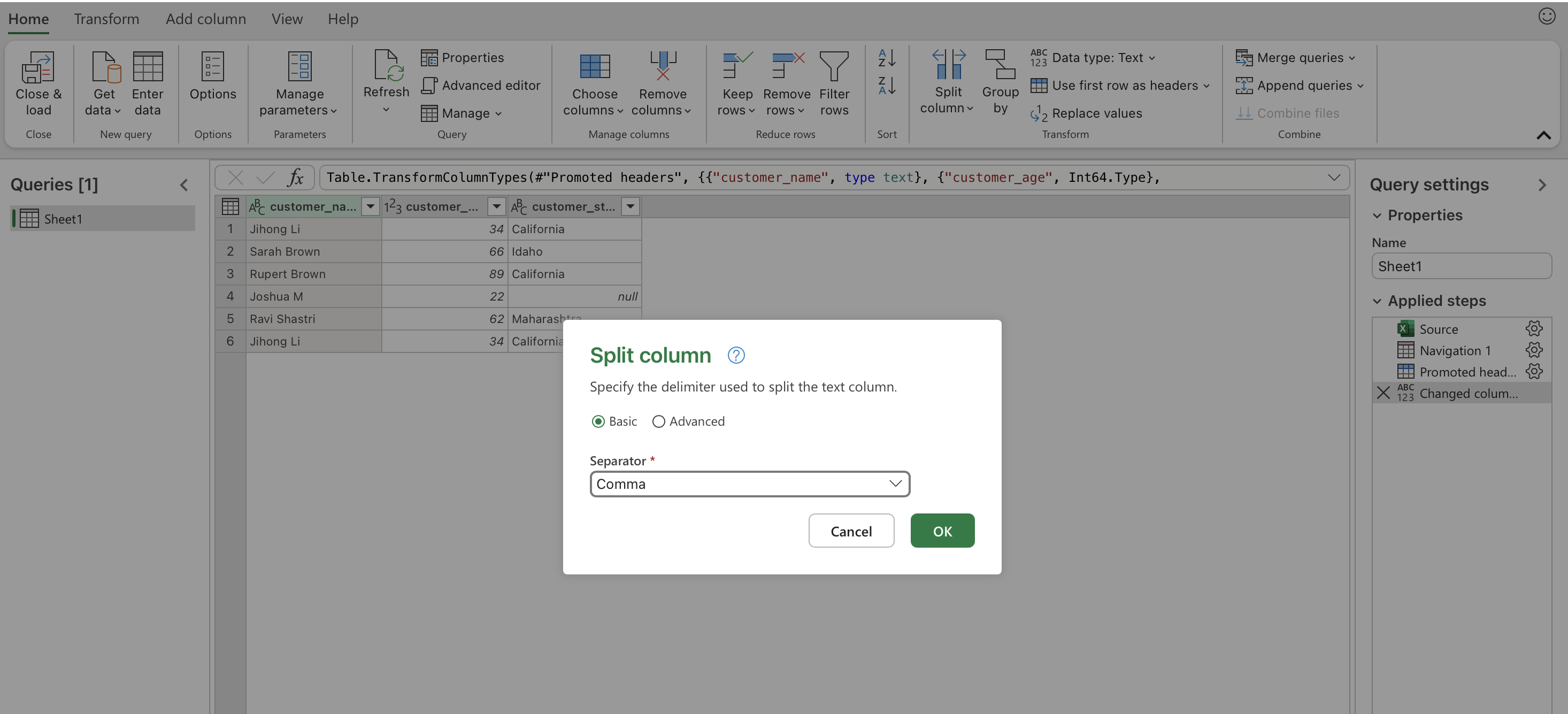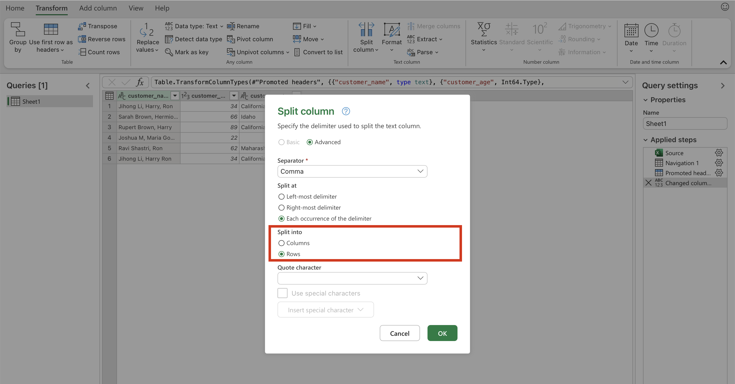 • Select the column you want to separate (e.g., customer_name if it contains values like “Jihong Li, Harry, Ron”)