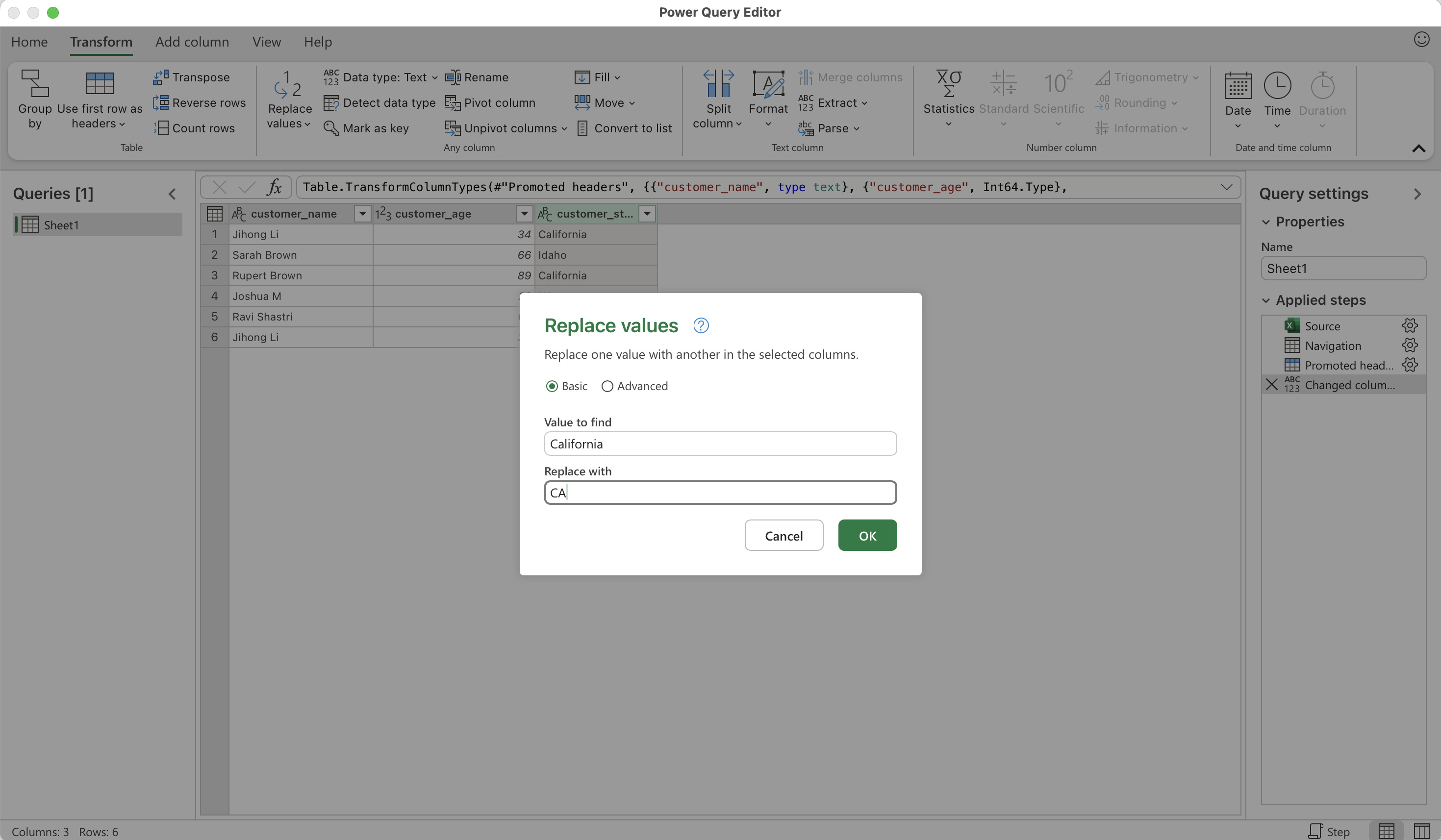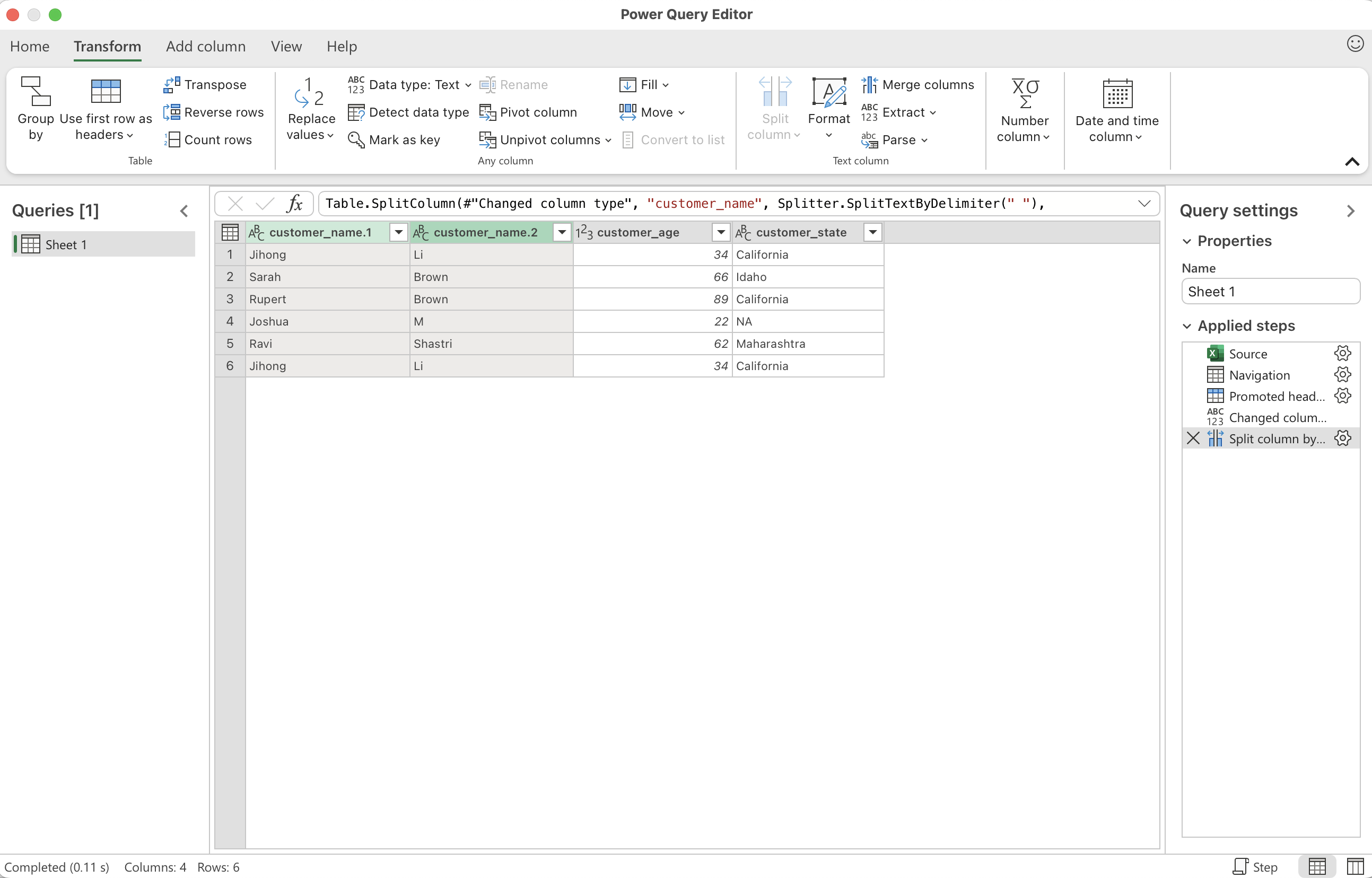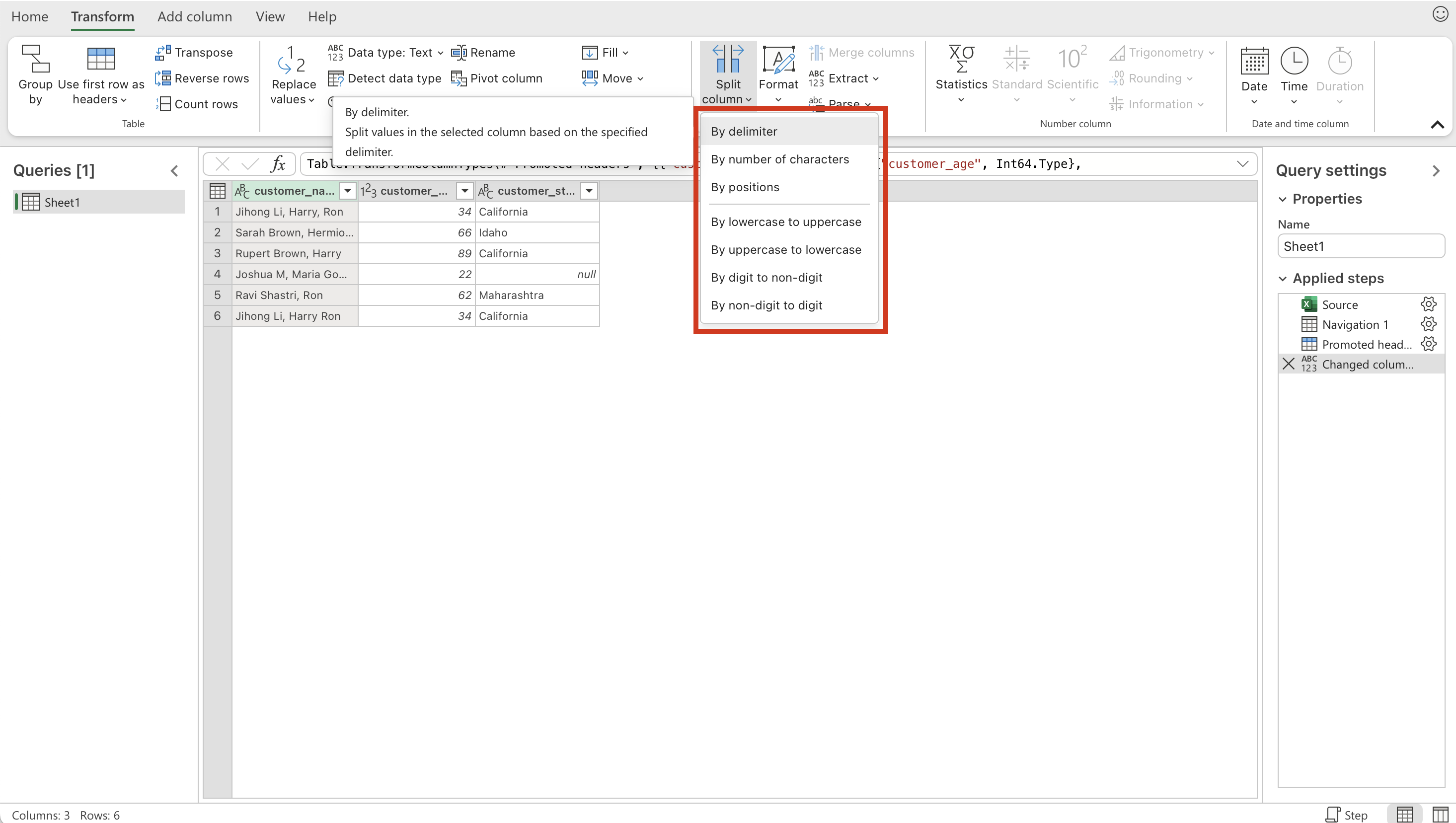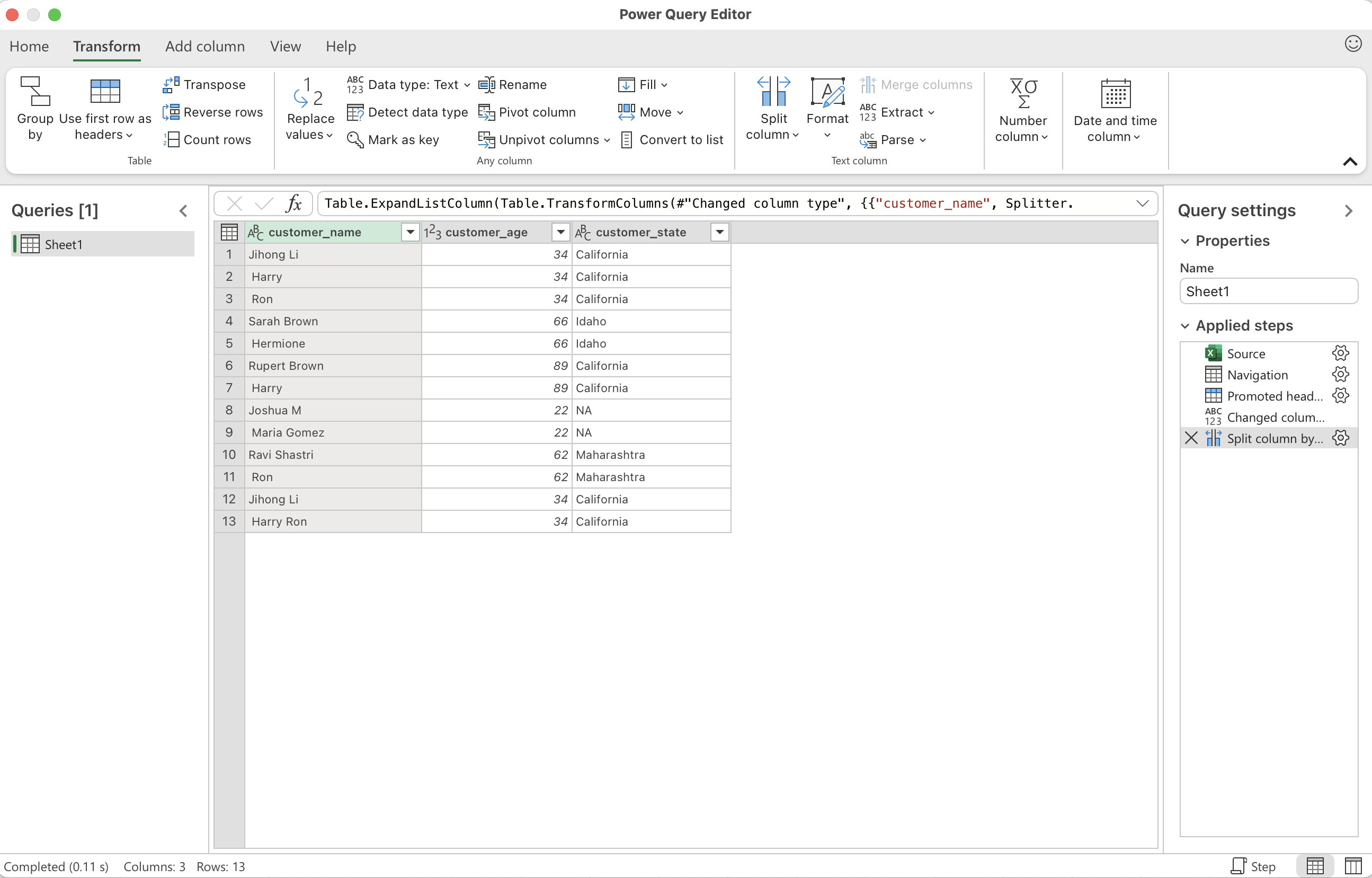 • Select the column you want to separate (e.g., customer_name if it contains values like “Jihong Li, Harry, Ron”)