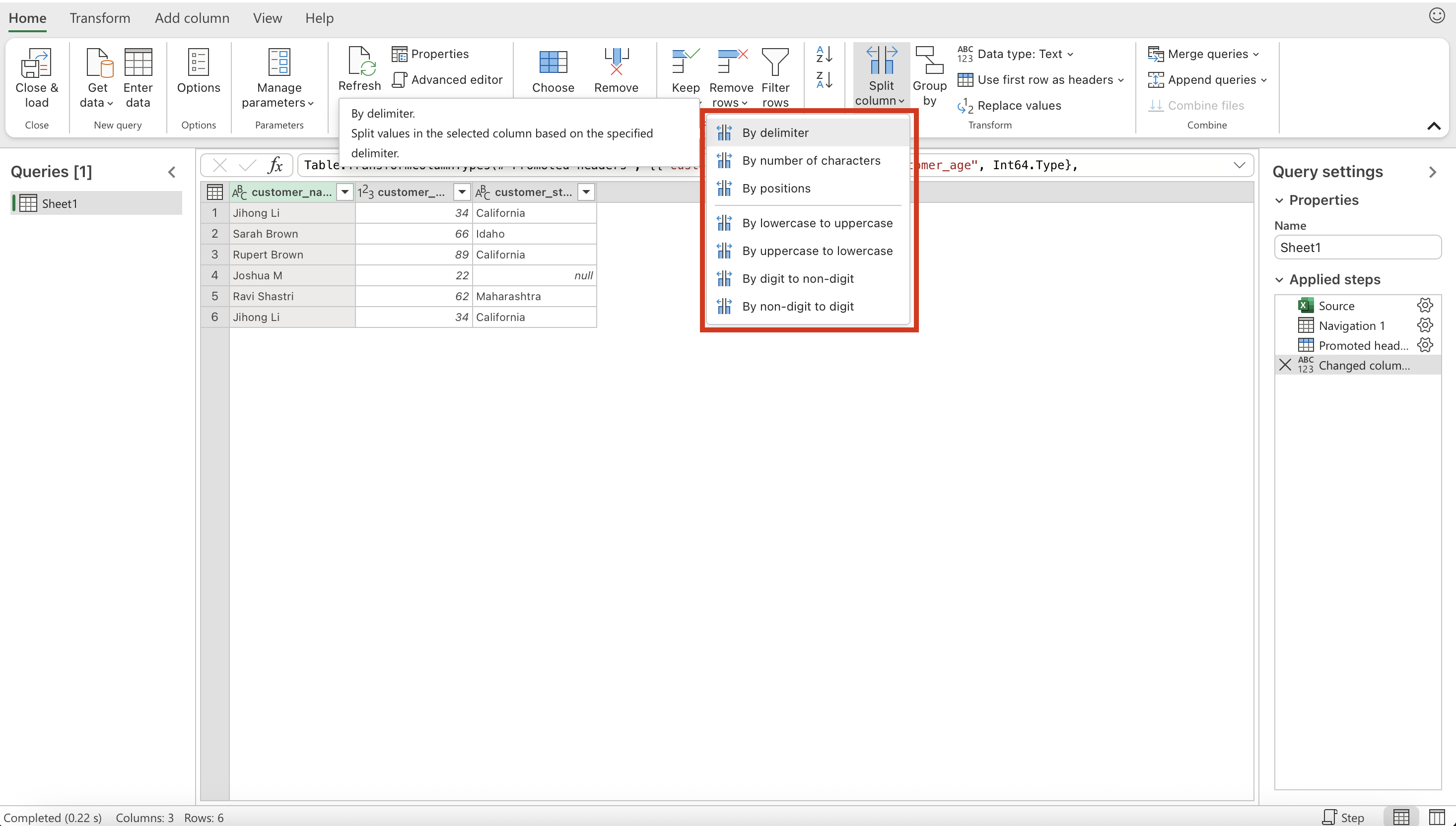 • Go to the Home tab, click Split Column, and choose By Delimiter (for example, a space ” “)