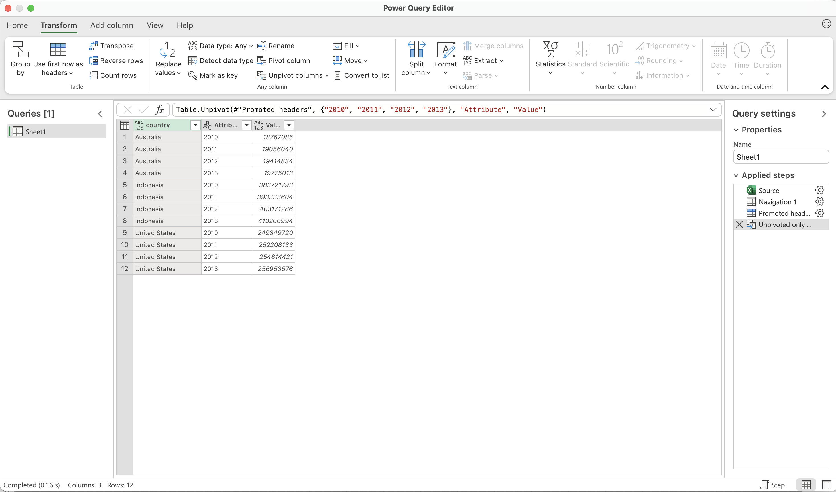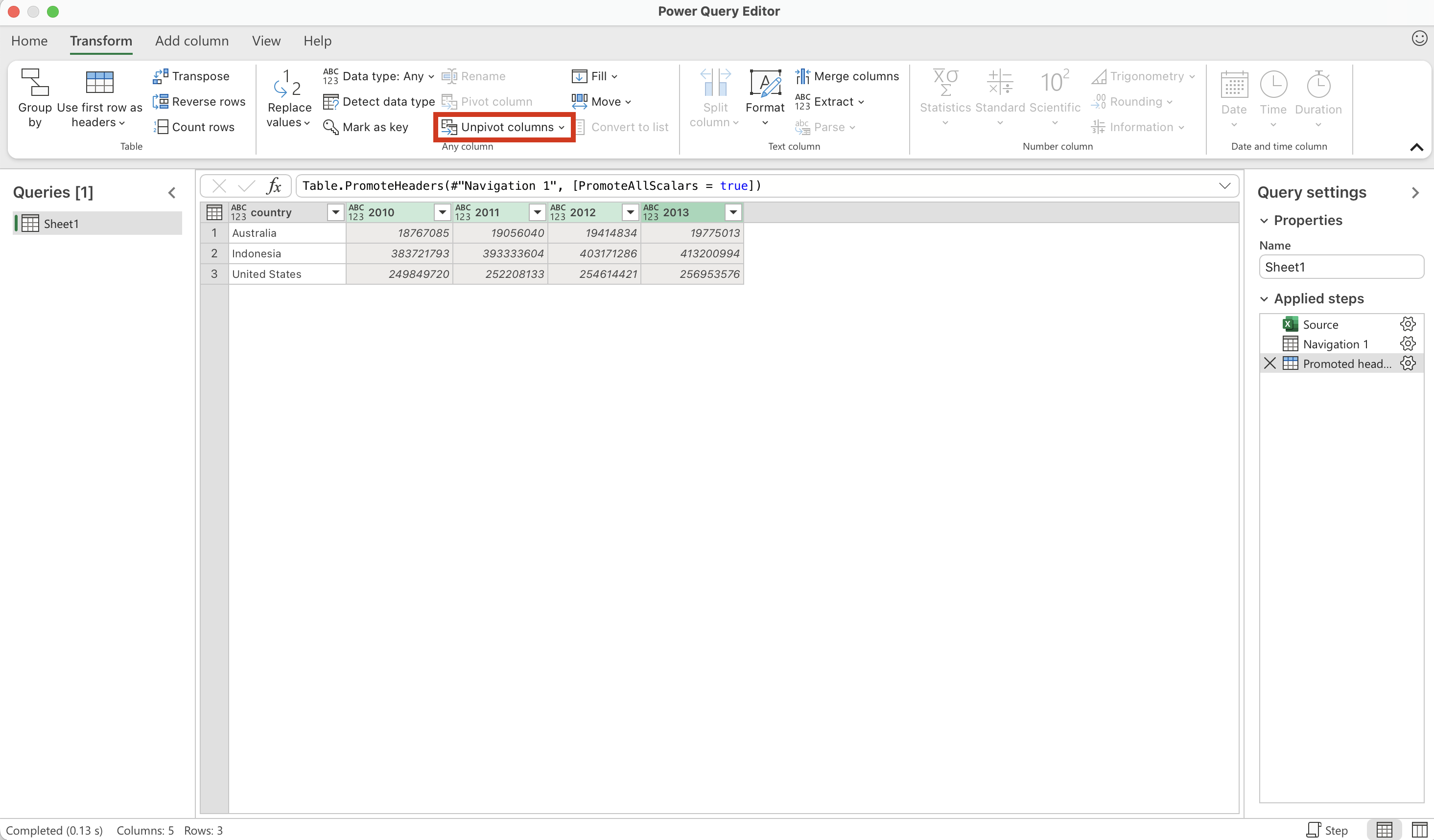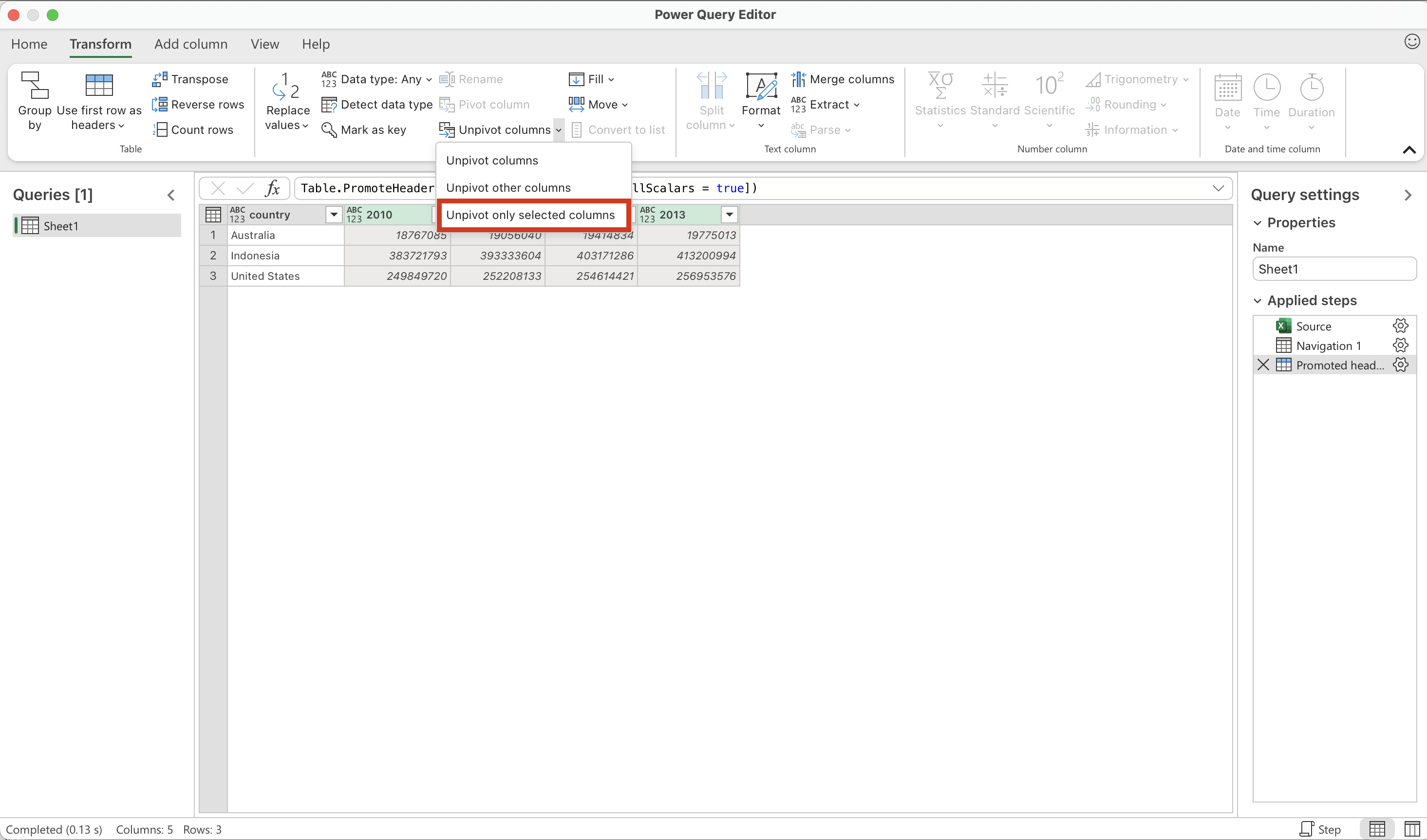 • Go to the Transform tab, click Unpivot Columns, and choose Unpivot Only Selected Columns (e.g., 2010, 2011, 2012, 2013)