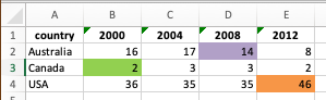 select(year, event, medal, country)Vizualize correlations between three variables